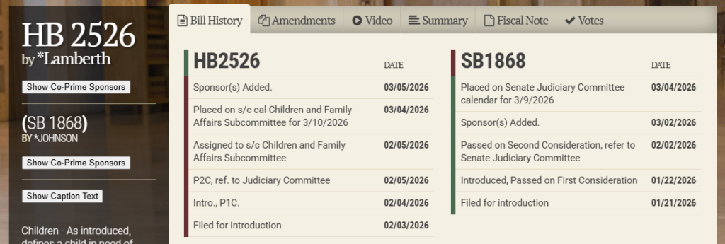 House Children and Family Affairs Subcommittee – HB2526 to be heard March 10