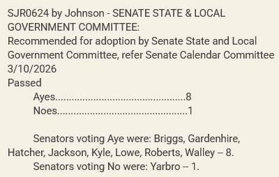 The House State & Local Government Committee passed the resolution 18-3 with three Democrats joining 15 Republicans to vote “Yes.” All “No” votes came from Democrats. HJR0808 must still clear the Finance, Ways, & Means Committee before moving to the House floor.