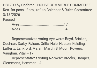 The House Commerce Committee had no questions or comments on the bill during their Wednesday meeting and passed the bill 17-4 along party lines. HB1709 will go the House Calendar & Rules Committee to be assigned a date for a vote on the House floor.