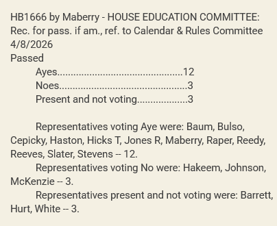 House Bill 1666 (HB1666), sponsored by Representative Aron Maberry (R-Clarksville-District 68), passed in a 12 to 3 vote along party lines. Three Republicans – Representatives Jody Barrett (R-Dickson-District 69), Chris Hurt (R-Halls-District 82), and Mark White (R-Memphis-District 83) – were present but did not vote.