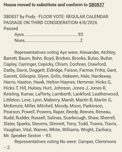 As the Senate passed SB0837 on Monday of this week with the same language as HB0849, the bill will not need to revisit either chamber before going to Governor Lee for signature into law.