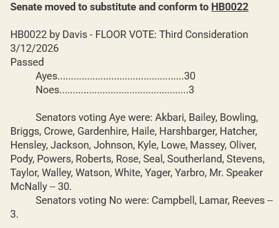 There were no further comments or questions, and the vote was 30-3 in favor, with Republican Shane Reeves joining two Democrats in voting “No”. However, four Senate Democrats joined the remaining Republicans to pass the measure, showing the bill carried decent bipartisan support in this chamber.