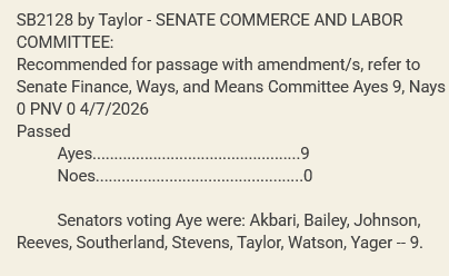 There were no questions or comments from committee members before the vote, which was a unanimous 9-0 in favor. SB2128 will now move to the Senate Finance, Ways, and Means Committee.