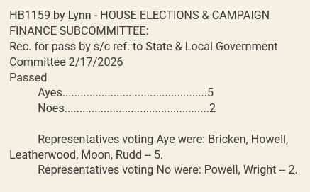 In the meantime, HB1159 will head to the full House State & Local Government Committee at a date yet to be determined. To contact members of this committee with thoughts on this legislation, use the information below: