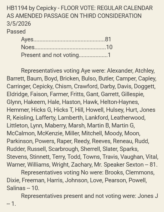Sponsored by Representative Scott Cepicky (R-Culleoka-District 64), House Bill 1194 (HB1194) as amended does away with existing exemptions in state law for private employers with less than six employees. The bill would lower from six to one, the number of paid employees an individual must have to be considered a private employer for the purposes of the Tennessee Lawful Employment Act.