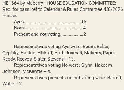 Sponsored by Representative Aron Maberry (R-Clarksville-District 68), House Bill 1664 now heads to the House Calendar and Rules Committee.