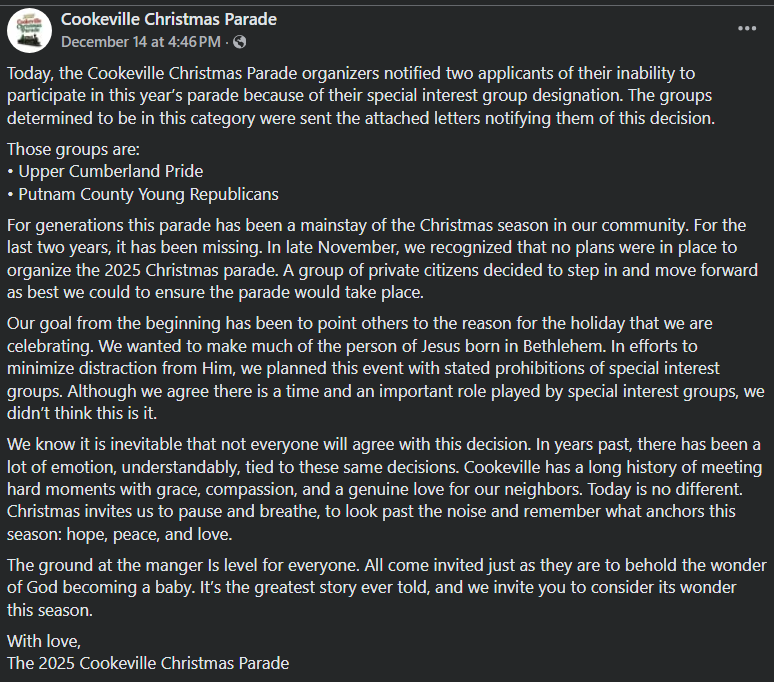 Because the group was underwriting the parade, their application included a Statement of Faith which sparked backlash from progressive members of the community and spurred the group “Cookeville Inclusive” to start working on a rival event that one community member dubbed the “Holiday Gay Pride Parade of Cookeville.”
