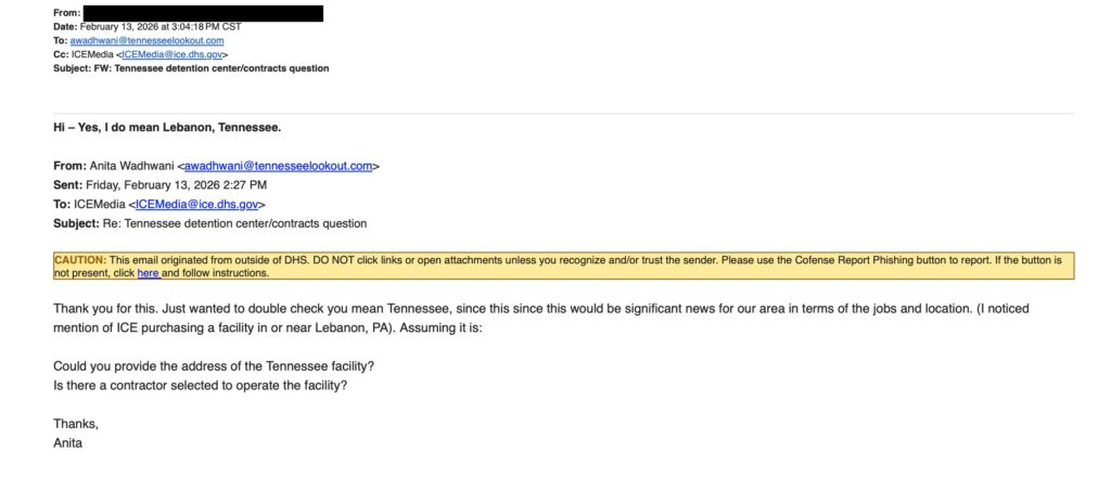 On Friday, a reporter for the Lookout emailed the ICE media department to ask whether the agency had plans to purchase, lease, or build detention facilities in Tennessee.