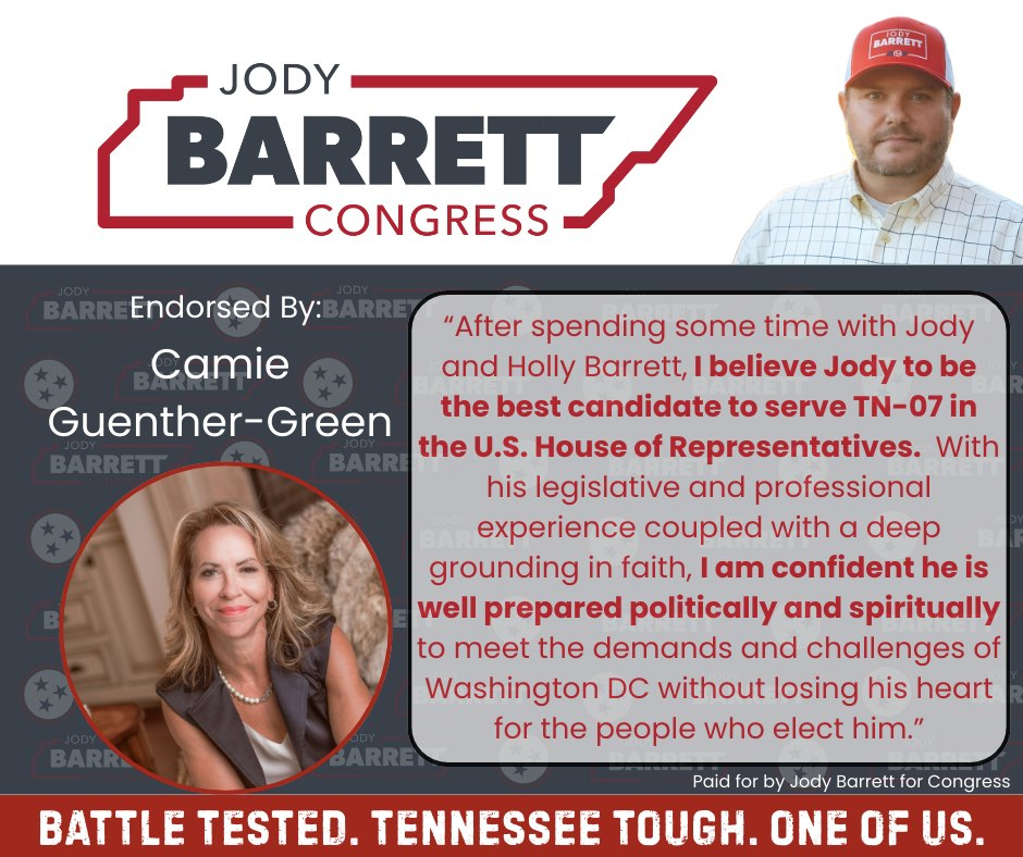 “After spending some time with Jody and Holly Barrett, I believe Jody to be the best candidate to serve TN-07 in the U.S. House of Representatives,” Guenther-Green said in the release. “With his legislative and professional experience coupled with a deep grounding in faith, I am confident he is well prepared politically and spiritually to meet the demands and challenges of Washington, D.C., without losing his heart for the people who elect him.”