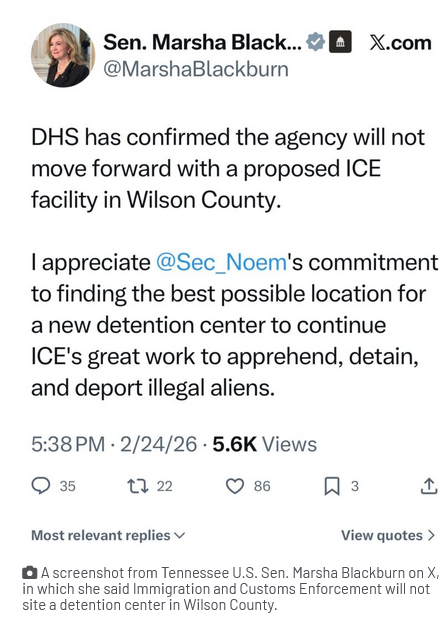 Tennessee Sen. Marsha Blackburn posted on X Tuesday that U.S. Immigration and Customs Enforcement “will not move forward” with plans to build an illegal immigrant detention mega center holding up to 16,000 detainees in Wilson County.