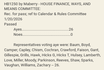 HB1250 passed the Finance, Ways, and Means Committee 26-0, and has been referred to the House Calendar and Rules Committee to secure a date for a full House vote.