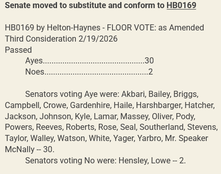 Tennessee Senators passed the bill by a vote of 30–2. Senators Adam Lowe (R) and Joey Hensley (R) voted against the bill; Senator Janice Bowling (R) abstained.