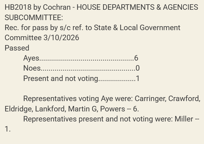 HB2018 will now move forward to the House State & Local Government Committee at a hearing date yet to be determined.