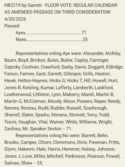 On the House floor Democrats proposed several amendments as a protest to the bill, none of which passed as they were largely grandstanding opportunities for the opposition. After a few more exchanges with Democrats after the amendments failed, the question was called and the body moved to the vote. HB2219 passed 71-25 and now waits on the Senate to pass their version before it can become Tennessee law.