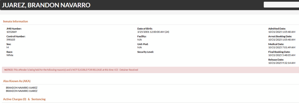 Police also arrested 24-year-old Brandon Navarro Juarez on October 21 on charges of DUI, criminal impersonation, and no driver’s license. He was booked on a $4000 bond. He was previously charged with not having a driver’s license and unlawful removal of a plate decal in 2020.