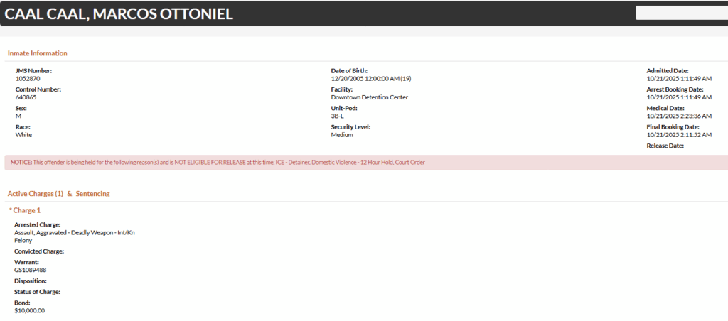 19-year-old Marcos Ottoniel Caal Caal was arrested on Tuesday, October 21. Caal was charged with aggravated assault with a deadly weapon. He was booked on a $10,000 bond.