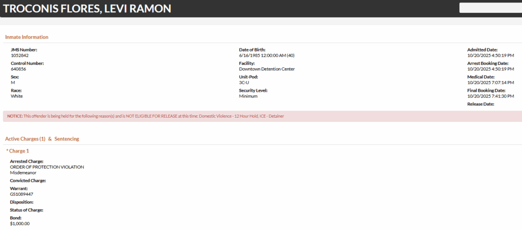 On Monday, October 20, 40-year-old Levi Ramon Troconis Flores was arrested. Flores was charged with an order of protection violation and was booked on a $1000 bond.