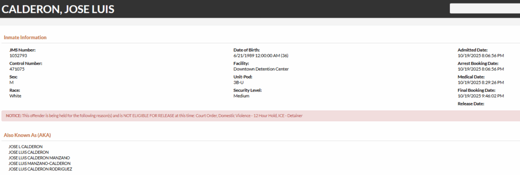 Police also arrested 36-year-old Jose Luis Calderon on October 19. Calderon was charged with two counts of violation of probation, resisting arrest, and aggravated assault (strangulation). He was booked on a $77,000 bond. Calderon’s probation violation stems from a 2024 charge of driving under the influence.