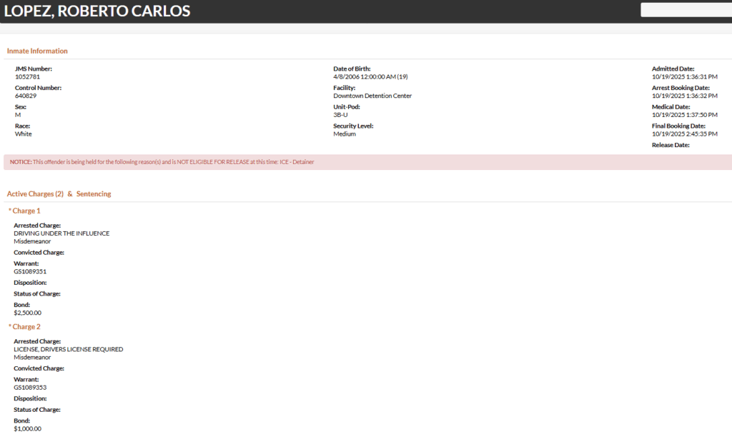19-year-old Roberto Carlos Lopez was arrested by Davidson County police on Sunday, October 19. He was charged with driving under the influence and driving without a license. He was booked on a $3500 bond.