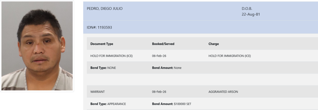 Investigators determined that the fire had been set intentionally, and surveillance video showed Pedro placing a container of flammable liquid onto the porch of the home and setting it on fire. He allegedly had been in an argument with one of the occupants of the home about a “perceived money debt.”