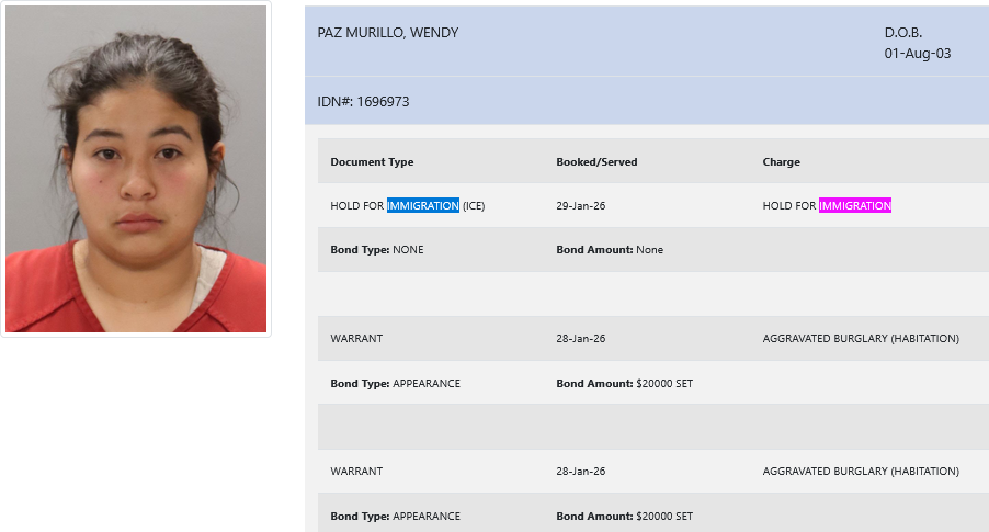 • Murillo was charged with two counts of aggravated burglary (habitation). She was booked on a $40,000 bond.