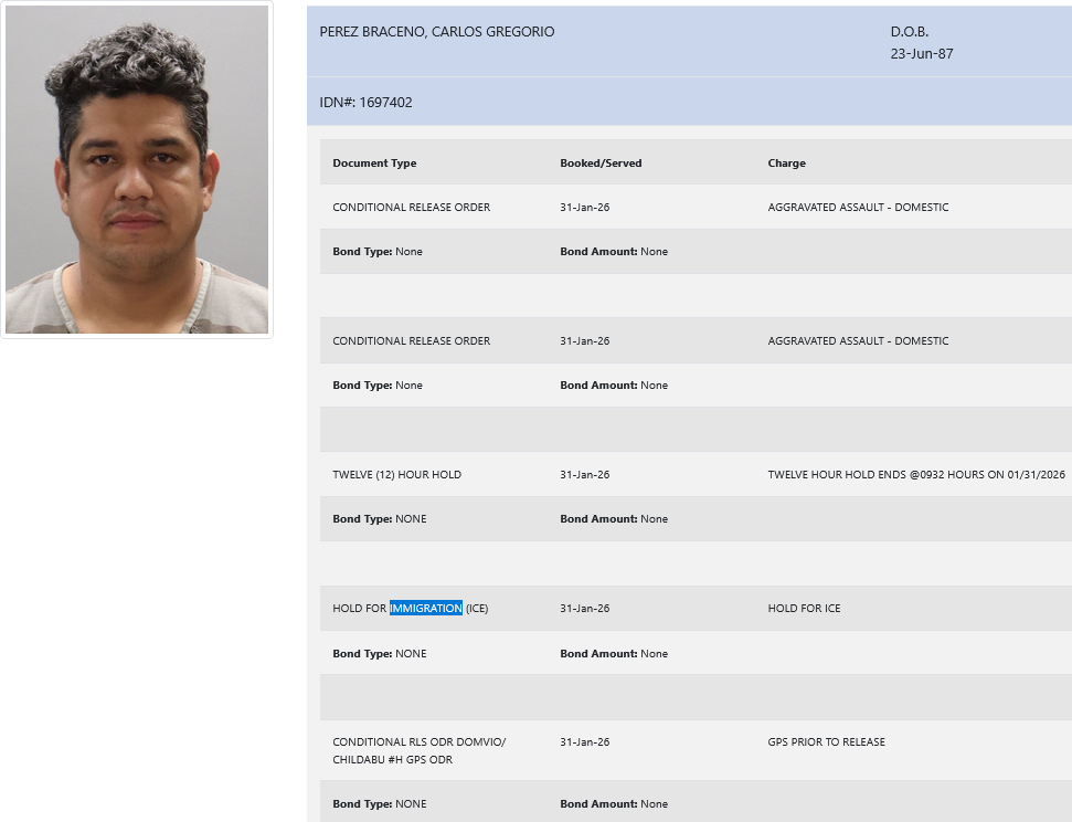 • Braceno was charged with aggravated domestic assault. He was booked with no bond.