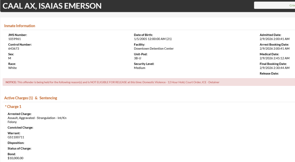 • Ax was charged with aggravated assault (strangulation). He was booked on a $10,000 bond.