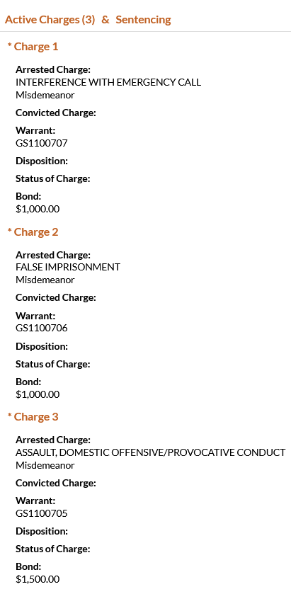 • Garcia was charged with interference with an emergency call, false imprisonment, and domestic assault. He was booked on a $3500 bond.