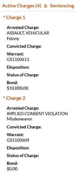 • Gabriel was charged with vehicular assault, implied consent violation, leaving the scene of an accident involving personal injury, and drivers license required. He was booked on a $12,000 bond.