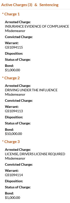 • Sanchez was charged with driving under the influence, insurance/evidence of compliance, and driver’s license required. He was booked on a $12,000 bond. Sanchez was recently arrested on November 3 for driving under the influence as well, along with two additional charges of implied consent – civil and no driver’s license.