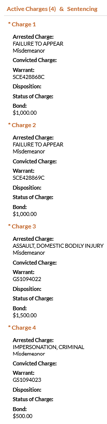 • Tadeo-Santizo was charged with two counts of failure to appear, domestic assault with bodily injury, and criminal impersonation. He was booked on a $4000 total bond. His charges of failure to appear stem from August 2025 charges of no driver’s license and insurance/evidence of compliance.