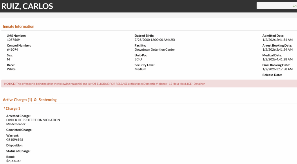 - Ruiz was charged with violation of an order of protection. That order came as a result of an outstanding charge of domestic assault with bodily injury from October 2025. Ruiz was booked on a $2000 bond.