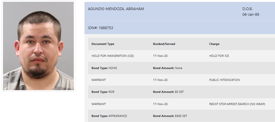 - Agundis-Mendoza was charged with public intoxication and resisting stop/arrest/search. He was booked on a $500 bond.