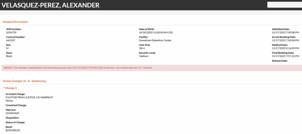 - Velasquez-Perez was charged with being a fugitive from justice and was booked on a $250,000 bond. No further information was available on this charge.
