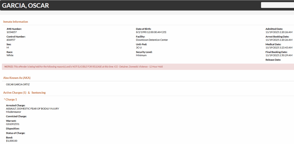 - Garcia was arrested and charged with domestic assault with fear of bodily injury. He was booked on a $1000 bond. He was previously arrested for domestic assault with bodily injury in 2022, but that case was retired.