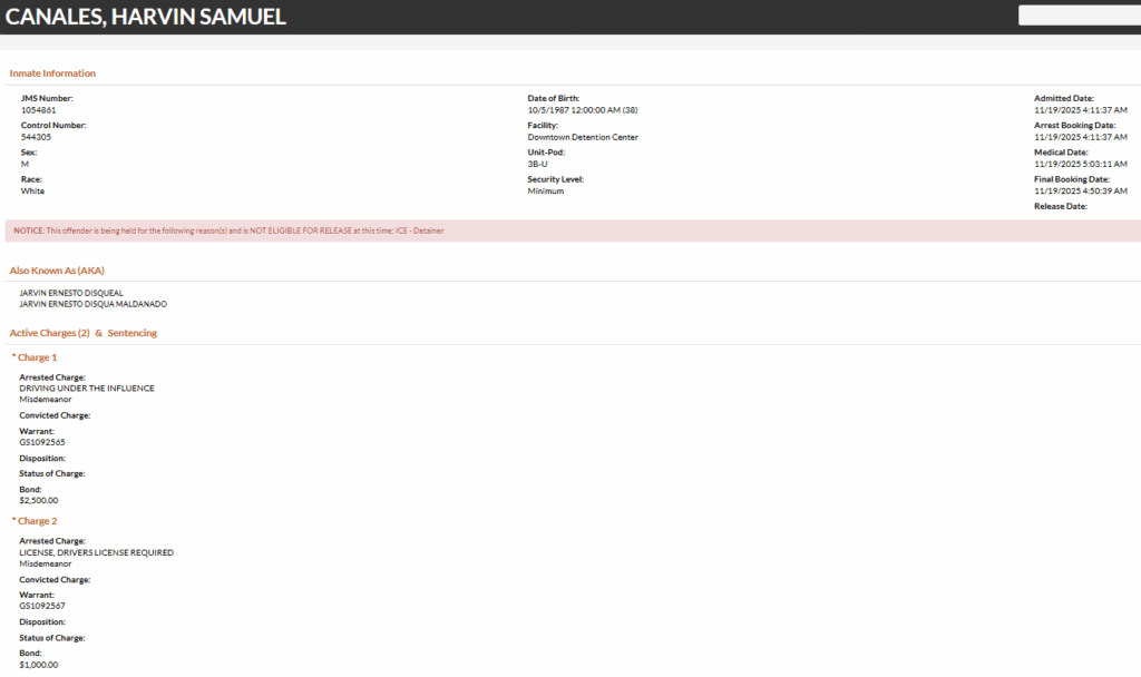 - Canales was charged with driving under the influence and driver’s license required. He was booked on a $3500 total bond. He was previously charged with no driver’s license twice in 2016 but those charges were dismissed.