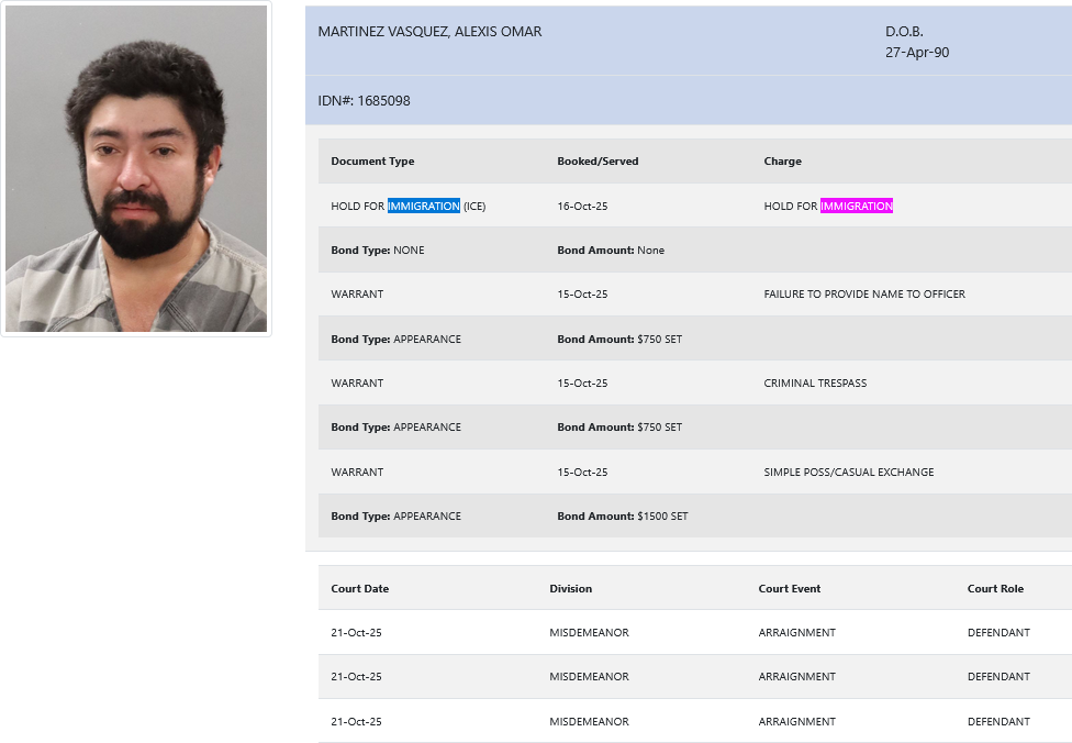 • Alexis Omar Martinez Vasquez (35 years old) – arrested October 16 – simple possession/casual exchange, criminal trespassing, failure to provide name to officer