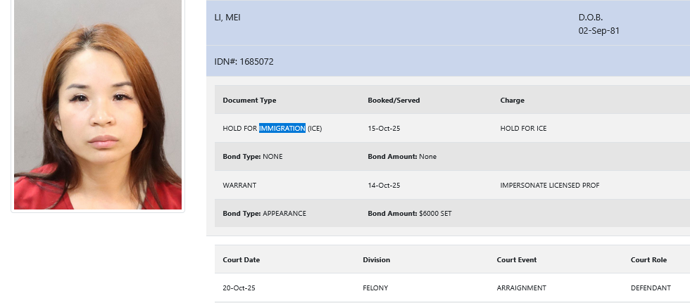 • Mei Li (44 years old) – arrested October 15 – impersonation of a licensed professional