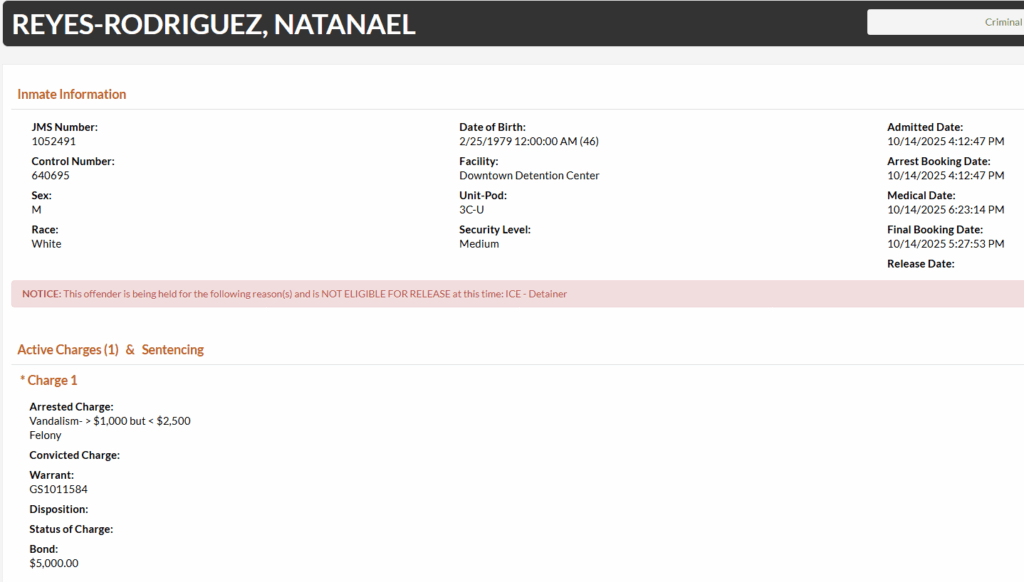 46-year-old Natanael Reyes-Rodriguez was arrested in Davidson County on Tuesday, October 14 on charges of vandalism between $1000 and $2500. He was booked on a $5000 bond.