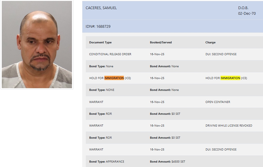- Caceres was charged with DUI (2nd offense), violating the open container law, and driving while license was revoked. He was booked on a $4500 bond.