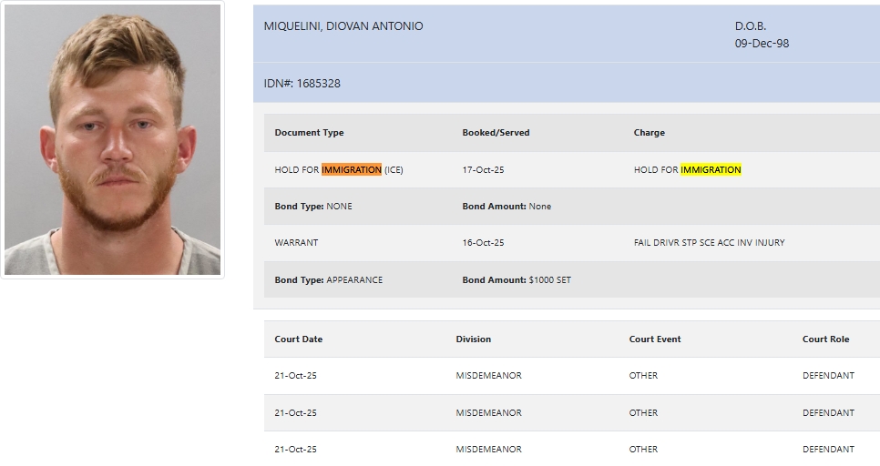In Knox County, police arrested 26-year-old Diovan Antonio Miquelini on Thursday, October 16 for failure to stop at the scene of an accident involving injury. He was booked on a $1000 bond.