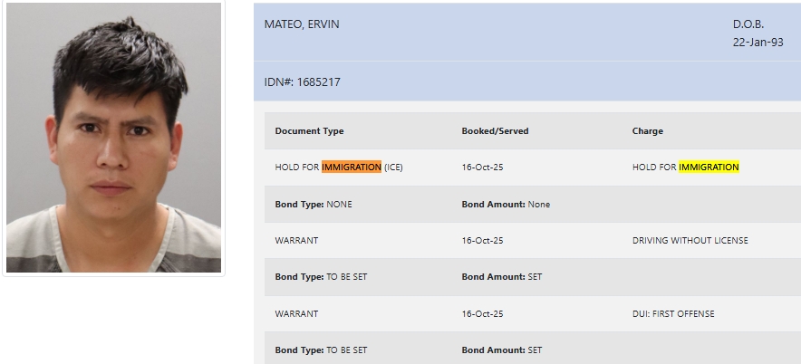 32-year-old Ervin Mateo was also arrested on October 16 and charged with DUI (first offense) and driving without a license.