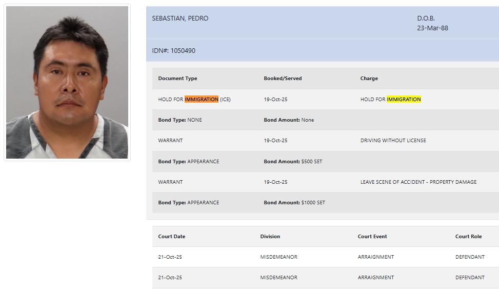 On October 19, police arrested 37-year-old Pedro Sebastian for driving without a license and leaving the scene of an accident with property damage.