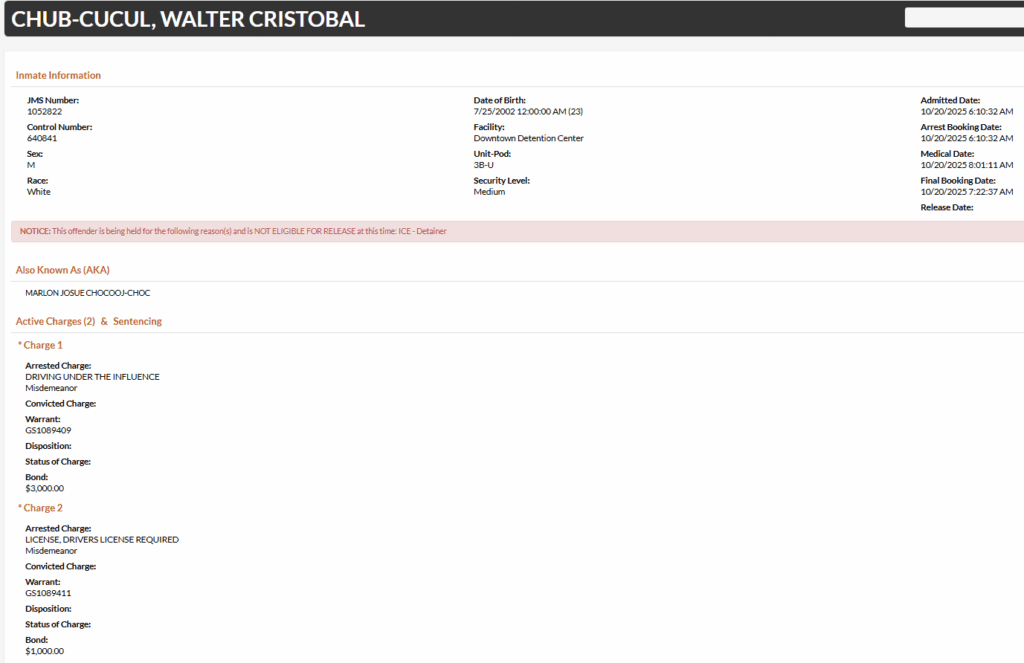 57-year-old Santiago Sub Cucul was also arrested on October 17 on charges of driving under the influence (3rd offense) and driving on a revoked license. He was booked on a $16,000 total bond. Cucul was found guilty in October 2020 of DUI, as well as multiple counts of vehicular assault. He was also charged with DUI in 2019.