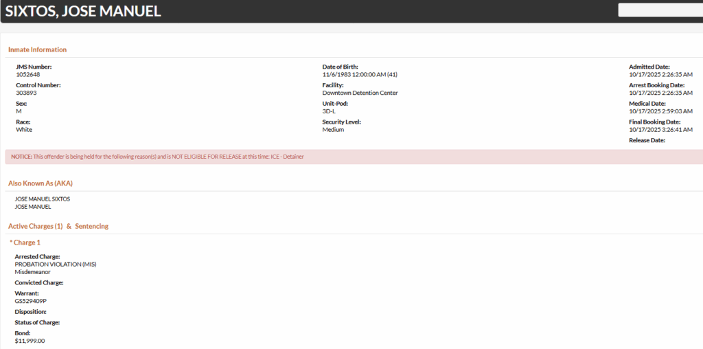 Davidson County police arrested 41-year-old Jose Manuel Sixtos on Friday, October 17. Sixtos was charged with a misdemeanor probation violation. He was previously charged with driving without a license in 2004, but those charges were dismissed. He was found guilty of the same offense in 2007. It is unclear if the probation violation is in relation to that guilty charge.