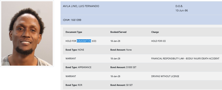 In a separate incident, illegal alien 29-year-old Luis Fernando Avila Lino was also arrested on Sunday for driving without a license and failure to follow the financial responsibility law in an accident with bodily injury or death. He was booked on a $1000 bond.