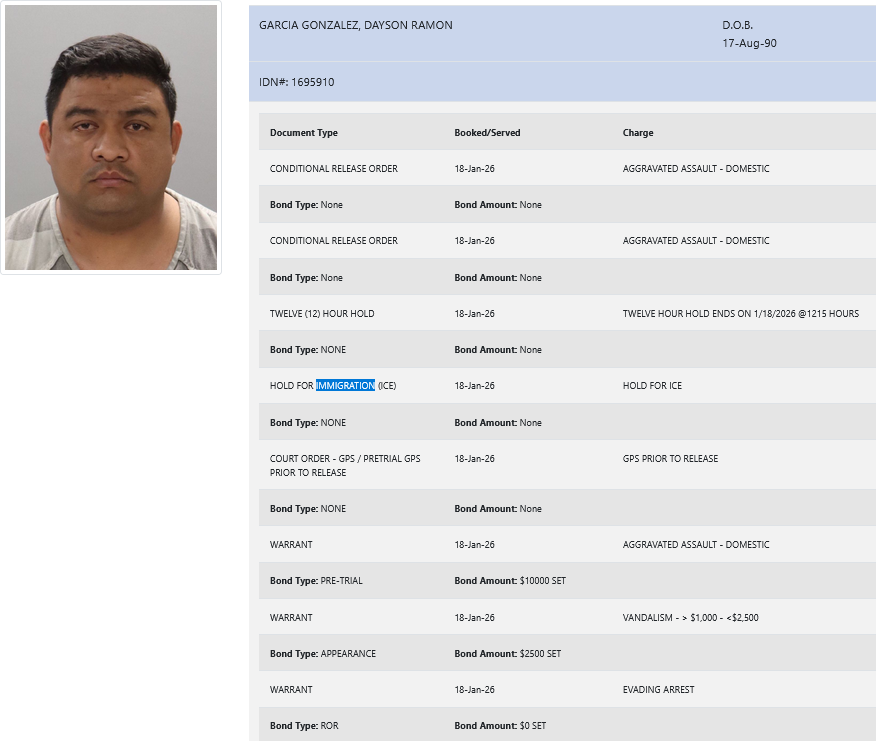 Knox County also arrested 35-year-old Dayson Ramon Garcia Gonzalez on charges of aggravated domestic assault, vandalism (>$1000 but <$2500), and evading arrest. He was booked on a $10,000 bond.