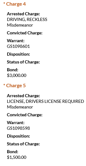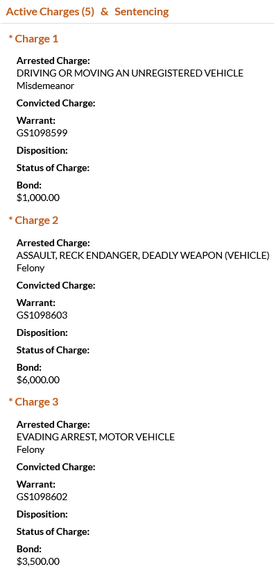 - Vazquez was charged with driving or moving an unregistered vehicle, assault/reckless endangerment with a deadly weapon (vehicle), evading arrest (motor vehicle), reckless driving, and driver’s license required. He was booked on a $15,000 bond.
