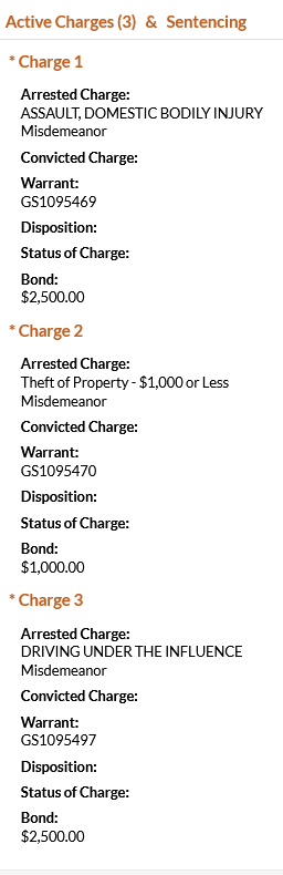 - Perez was charged with aggravated domestic assault with bodily injury, theft of property ($1000 or less), and driving under the influence. He was booked on a $6000 total bond.