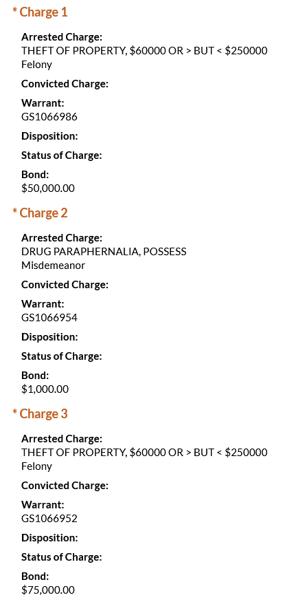 - Ballo was charged with two counts of theft of property (less than $60,000 but greater than $25,000), possession of drug paraphernalia, hold or use altered or false document or plate, vehicle theft ($10,000+ but less than $60,000), and driver’s license required. He was booked on a $158,000 bond.